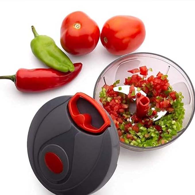 - Featuring sharp and durable stainless steel blades and a unique string design, this manual chopper chops and cuts vegetables in a hassle-free manner with minimal effort. When the thread is pulled, the blades rotate so it can also be used as mixing purpose.